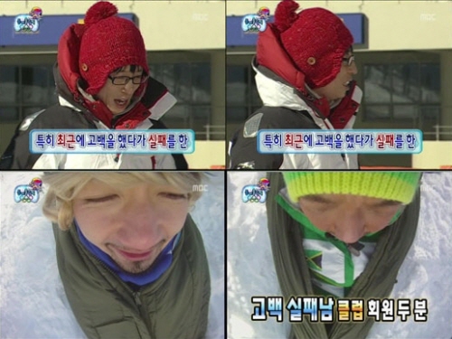 12일 방송된 ‘무한도전’에서 유재석은 노홍철과 하하가 대결을 펼치자 큰 소리로 “고백 실패 종결자들의 대결”이라고 소개했다. 여기에 ‘고백 실패남 클럽 회원 두 분’이란 자막으로 시청자들의 웃음을 자아냈다.