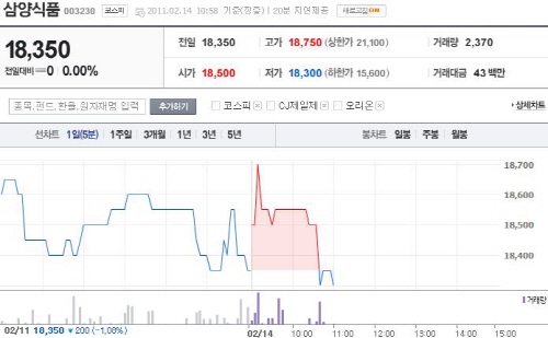 삼양식품은 이날 오전 9시8분 전거래일보다 2.18%(400원) 상승한 1만8천750원에 거래되는 등 급등세를 보였다. 오전 11시 현재 1만8천350원으로 다소 하락했으나, 지난해 12월부터 이어진 상승세가 지속되고 있다.