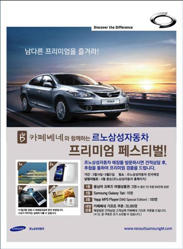 르노삼성자동차는 오는 3월31일까지 커피전문점 카페베네와 공동마케팅을 펼친다고 15일 밝혔다.