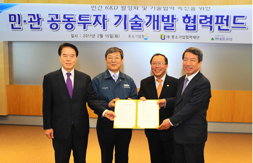 현대중공업은 울산 본사에서 이재성 사장과 정운찬 동반성장위원장, 김동선 중소기업청장, 안병화 대중소기업협력재단 사무총장 등이 참석한 가운데 ‘민·관 공동 기술개발 협력펀드 협약식’을 가졌다고 15일 밝혔다.