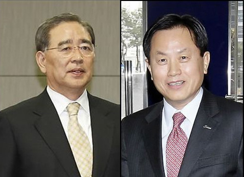 한동우 신한금융지주 회장 내정자(왼쪽)와 서진원 신한은행장.(사진-연합뉴스)