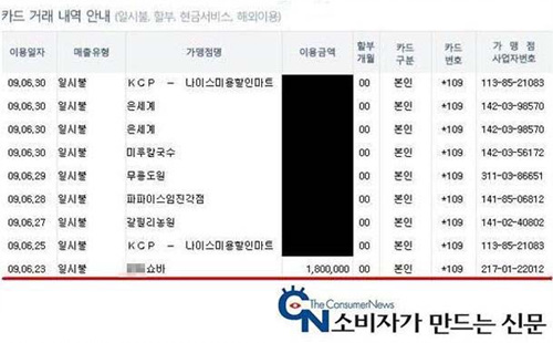 본지가 입수한 한 소비자의 카드결제 청구서에 따르면 이회사 쇼버 가격은 180만원에 달한다. 시중 쇽업쇼버의 가격은 30~40만원대.