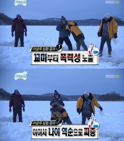 B팀에 속한 박명수가 배고픔에 지쳐 라면을 먹고 있는 A팀으로 가 음식을 줄것을 요구하지만 거절당하자 이글루를 부수고 달아났기 때문.