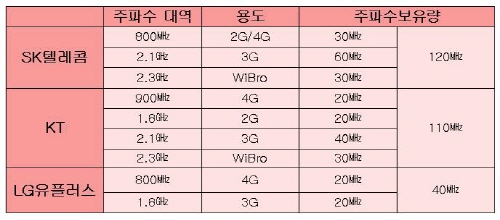 주파수총량제를 사업자가 보유한 전체 주파수로 한정한다면 SK텔레콤과 KT가 비슷한 수준이고 LG유플러스가 1/3에 불과한 상황이다. SK텔레콤과 KT가 배제된다면 LG유플러스가 가장 유리하다. 반면 2.1㎓라는 특정범위로 제한한다면 이를 가장 많이 확보하고 있는 SKT만 경매에서 제외될 수 있다.