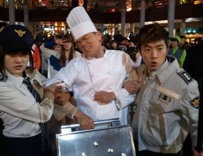 박진영은 최근 자신의 트위터에 “사진 보시고 16회 보고 싶나요?”라는 글과 함께 중국집 주방장 복장을 한 채 손에는 철가방을 든 채 경찰에게 잡혀가는 사진을 개제했다.