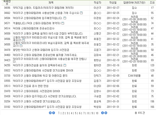 신동아 파밀리에 날림공사여부와 관련한 입주예정자들의 불만은 고양시청 홈페이지까지 가득 메우고 있다.