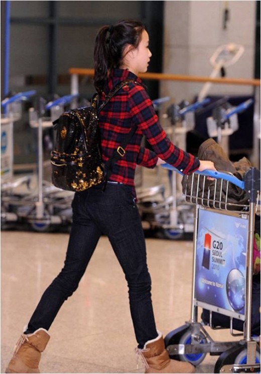 손연재는 이날 빨강과 검정색이 매치된 남방에 타이트한 청바지를 입고 광택이 나는 고급스러운 백팩을 메고 공항에 나타났다.