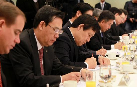 한국SC제일은행 리차드 힐 행장(왼쪽부터), 농협중앙회 김태영 대표이사, 하나은행 김정태 행장, 국민은행 민병덕 행장, 우리은행 이종휘 행장 등 시중은행장들이 3일 서울 중구 명동 은행회관에서 열린 '금융감독원 은행CEO 조찬 간담회'에서 김종창 금감원장의 인사말을 메모하고 있다.