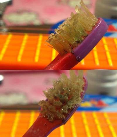 사진 속 어린이용 칫솔의 칫솔모는 누렇게 변색되고 오물이 군데군데 붙어있어 이를 본 네티즌들이 경악을 금치 못하고 있다.