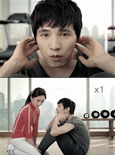 이 광고에서 원빈은 여성 트레이너가 코칭해 줄 땐 느릿느릿 윗몸일으키기를 하다가 근육질의 남성 트레이너가 코칭해 주자 엄청난 속도로 윗몸일으키기를 한다.