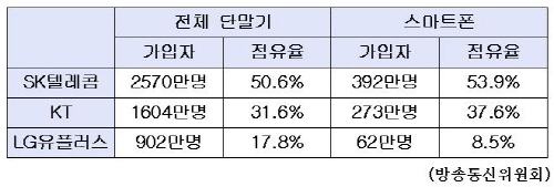 스마트폰의 경우는 더욱 심각해서 전체 727만명의 가입자 중 SK텔레콤, KT, LG유플러스가 각각 392만명(53.9%), 273만명(37.6%), 62만명(8.5%)를 차지했다. 스마트폰으로 넘어오면서 그나마 시장 점유율이 반토막 난 것이다,
