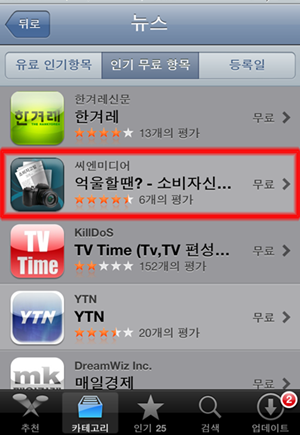 지난달 26일 등록하자마자 무서운 기세로 치고 올라 5일만에 애플 앱스토어 뉴스 부문 무료앱 인기순위 '2위'(전체무료앱순위 77위)를 기록했다.이날 오후 한때 1위까지 올랐었다.