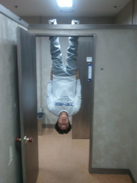사진 속 김병만은 문 틀에 두 발을 걸쳐, 마치 박쥐처럼 거꾸로 매달려 있는 모습이다.