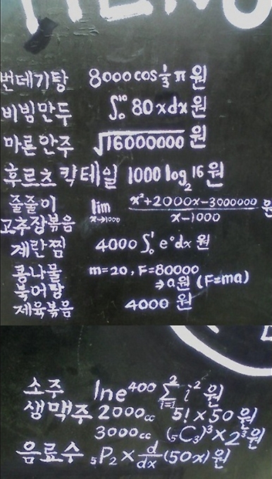 한 대학교 축제 주점에서 사용된 가격표로 알려진 이 메뉴판은 제육볶음을 제외한 메뉴들의 가격을 모두 루트나 로그, 미적분 등으로 표시해 놓았다.