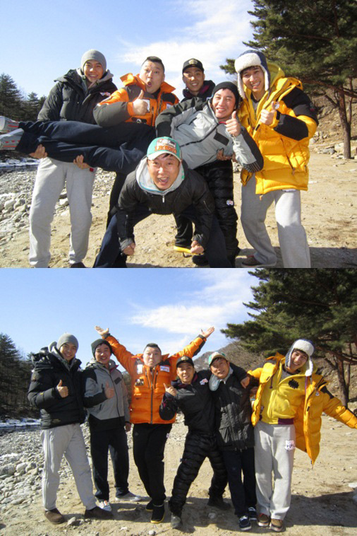 사진 속 엄태웅은 이수근의 허리 위에 누워 멤버들의 부축을 받으며 환하게 웃는 모습을 보이기도 하고 이승기의 옆에서 엄지손가락을 추켜 세우며