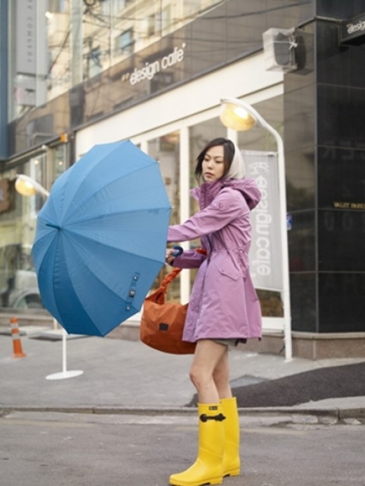 사진 속 김민희는 보라색 트렌치 코트에 노란 장화, 파란 우산, 주황색 가방 등이 뒤섞인 화려한 색감의 패션을 선보였다.