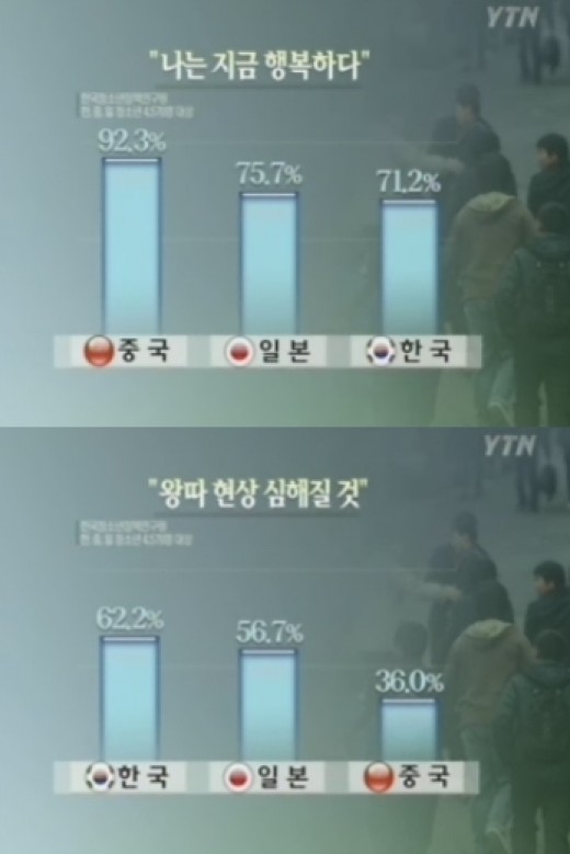 중국은 92.3%의 청소년들이 행복하다고 느낀 반면 한국은 71.2%만이 행복하다고 느꼈다. 75.7%의 일본에도 뒤진 가장 낮은 수치다.