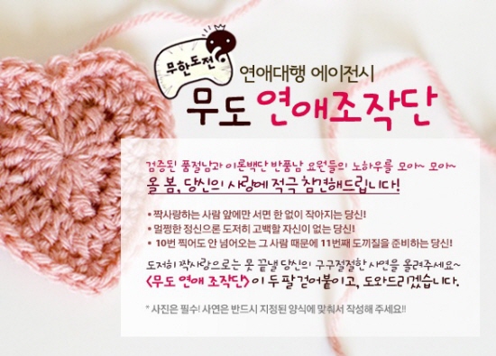 홈페이지에서는 “연예대행 에이전시 무도 연애조작단. 검증된 품절남과 이론백단 반품남 요원들의 노하우를 모아~ 모아~ 올봄, 당신의 사랑에 적극 참견해드립니다”라는 글을 게시해 참가자들을 모집하고 있다.