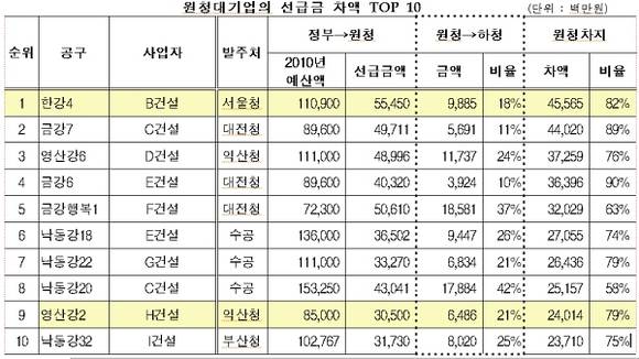 청구된 자료에 따르면 4대강사업 중 6개 공구의 공사를 발주한 원주청의 선급금 차액비율이 88%(약 165억원)로 가장 높았으며, 차액이 가장 많은 곳은 대전청(약 1천597억원, 77%)인 것으로 나타났다.