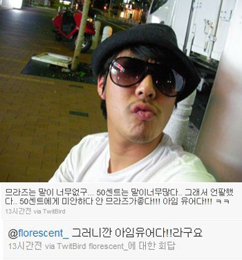 지난 8일 하하는 자신의 트위터에 “므라즈는 말이 너무 없고 50센트는 말이 너무 많다. 그래서 언팔했다. 50센트에게 미안하다. 난 므라즈가 좋다! 아임 유어다!”라는 글을 올렸다.