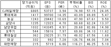 10일 종가를 기준으로 CJ제일제당에 이어 삼양사(4.7배), 남양유업(4.91배), 대한제당(6.86배), 대상(7.28배), 오뚜기(7.97배) 순으로 집계됐다. 농심(10.69배)과 롯데제과(14.35배) 롯데칠성(31.79)가 뒤를 이었다.