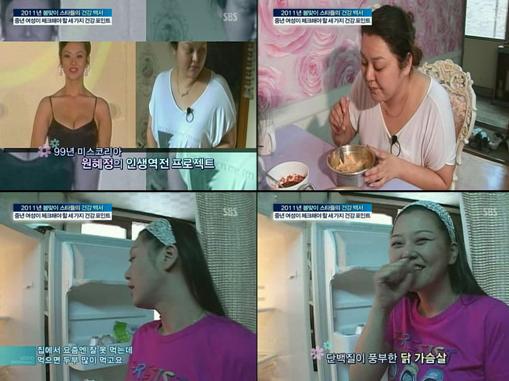 이날 방송에서 원혜정은 "집에서 두부를 많이 먹고 일주일에 한 번 정도는 닭가슴살을 쪄서 먹는다"고 소개했다. 그녀는 이 같은 식이요법과 더불어 런닝머신과 아령 등을 이용한 꾸준한 운동을 추천했다.