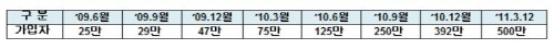 SK텔레콤의 스마트폰 가입자는 2009년 6월 말 25만명에 불과했으나 2009년 12월 말 47만, 2010년 6월 말 125만, 2010년 12월 말 392만 명에 이어 올해 3월 12일 500만명으로 크게 증가해 왔다.