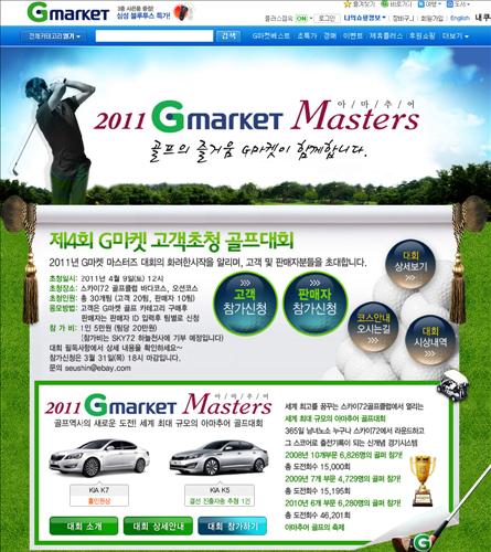 G마켓은 스카이72 골프클럽과 공동으로 2012년까지 3년간 'G마켓 마스터즈 골프대회'를 진행키로 하고 올해 대회 참가 신청을 받고 있다. G마켓 마스터즈 골프대회는 지난 2007년부터 열리는 최고 수준의 아마추어 골프대회다. 올해 대회는 개인과 단체로 나눠 20여개 부문에서 4월부터 예선전이 진행된다.