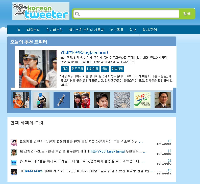 코리안 트위터는 오늘의 화제 트위터, 트위터 랭킹정보, 트위터 사용법 등을 한눈에 볼 수 있는 트위터 전문 포털이다. 오늘의 화제 트위터는 처음 트위터를 시작하는 초보들에게 필수적 코스가 되고 있다. 사용하기 어려워하는 유저들을 위한 알기 쉬운 트위터 이용법도 제공하고 있다.