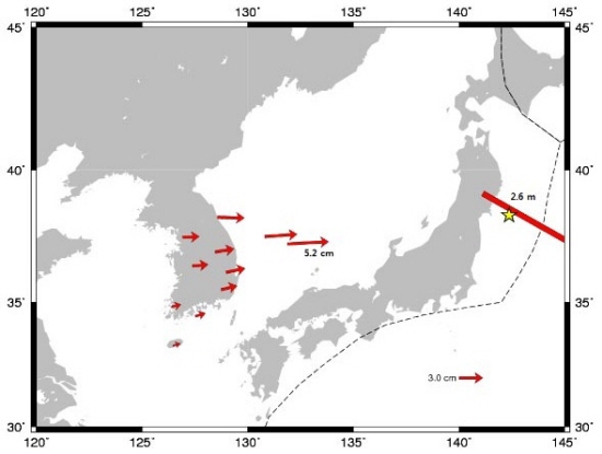 일본 지진의 영향으로 한반도가 최대 5㎝ 가량 동쪽으로 이동한 것으로 나타났다.