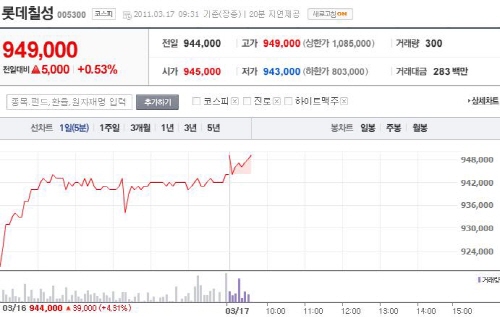 롯데칠성은 17일 오전 9시30분 현재 전날보다 5000원 오른 94만9천원에 거래되고 있다. 지난 16일에는 전날보다 무려 3만9천원(4.31%) 오른 94만4천원에 거래를 마치는 등 강세를 보이고 있다.