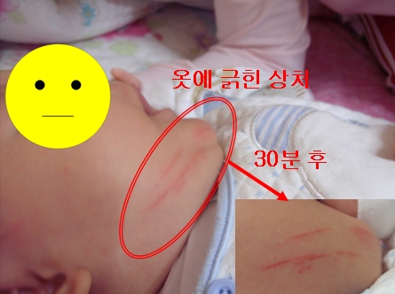 기쁜 마음에 아이에게 옷을 입힌 정 씨는 몇 시간 뒤, 화들짝 놀랐다. 생후 60일된 아기의 턱 주변에 붉게 긁힌 상처가 발견된 것.