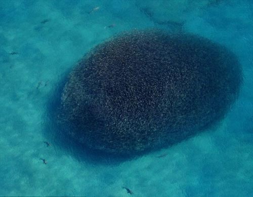 다양한 종류의 상어 1만여 마리에 둘러싸인 물고기들은 거대한 원형을 이루며 자기방어에 나섰고 에버네시는 이 물고기들을 식별하기 어려웠지만 정어리 떼로 추정된다고 말했다.