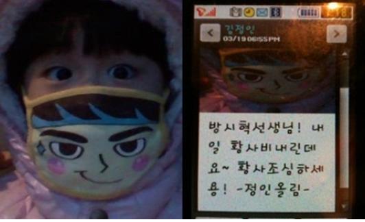 또 김정인이 방시혁에게 보낸 문자에는 "방시혁 선생님! 내일 황사 내린데요~ 황사 조심하세용! -정인올림-"이라는 글귀가 적혀져 있어 방시혁으로 하여금 아빠미소가 절로 나오게 했다.