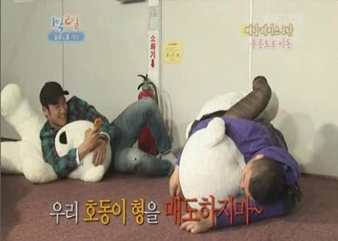 특히 엄태웅은 울릉도로 향하는 배 안에서 김종민으로부터 "같이 있는 멤버들(이수근.강호동)중 믿을 사람 없다. 나와 동맹 맺자"는 내용의 문자메시지를 받고 "호동이 형은 그런 사람 아니다"라는 답장을 보내 ‘호동빠’라는 별명을 얻었다. 답장을 받은 김종민과 이승기, 은지원 역시 "엄태웅은 강호동의 남자"라고 놀려댔다.