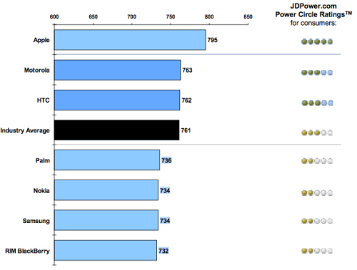 조사대상인 국내외 7개 제조사 중 삼성전자는 블랙베리를 간신히 제치며 노키아와 공동 5위에 오르는 데 만족해야 했다. 이는 평균 점수인 761점에도 못 미치는 수준이다. 이 조사에서 애플은 795점으로 1위를 차지했다.