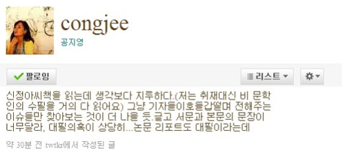 공지영은 24일 자신의 트위터에 “신정아씨 책을 읽는데 생각보다 지루하다”며 “기자들이 호들갑 떨며 전해주는 이슈들만 찾아보는 것이 더 나을 것 같다”는 소감을 올렸다.