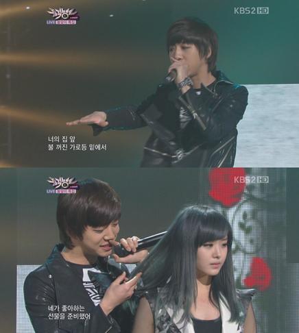 지난 25일 KBS 2TV '뮤직뱅크' 무대에서는 송지은의 머리카락을 매만지는 등 과감한 모습도 선보였다.