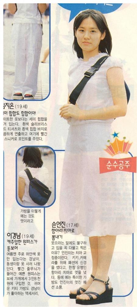 사진 속 손예진은 당시 17살로 길거리 패션을 소개하는 코너에서 ‘순수 공주’로 뽑혀 지금보다는 앳된 얼굴과 통통한 몸매를 보이고 있지만 여전히 청순한 미모를 뽐내고 있다.