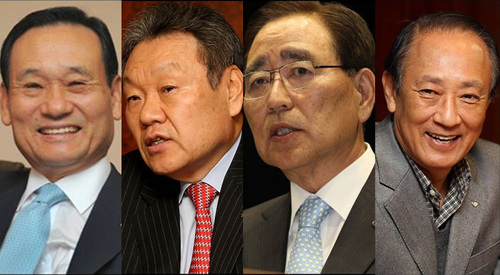 한동우 신한금융지주 회장, 김승유 하나금융지주 회장. 사진-연합뉴스>
