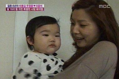 이윤미는 돌도 안된 아이의 체중이 12kg이나 나간다면서 “태어났을 때 주영훈이 4.8kg, 내가 3.9kg이었다"고 설명했다. 우량아의 유전자를 물려받은 아라 역시 현재 건강하게 성장하고 있다는 것.