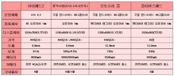 지난해 일찌감치 선두자리에 올라선 '아이패드'와 그 뒤를 바짝 쫓던 '갤럭시탭'이 국내 태블릿PC 시장을 양분했다면, 올해는 앞선 두 제품의 후속작들과 LG '옵티머스패드', 모토로라 '줌'까지 출시되며 춘추전국시대를 맞이하게 됐다.