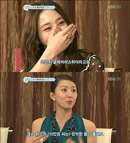 이에 김희애는 “난 이민정이 너무 예뻐서 얼굴만 봤다. 그런데 저번에 병원신을 찍을 때 이민정이 타이트한 옷을 입었는데 은근 글래머러스하더라. 그래서 너무 공평하지 않다고 했더니 이민정은 겸손 하느라 빈약한 몸이 좋다고 했다”며 ‘순간 욱한’ 사연을 전했다.