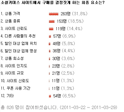 네티즌들이 소셜커머스 사이트에서 구매를 결정짓게 하는 최종 요소로 상품 가격을 꼽았다.