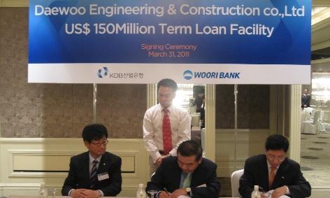 대우건설은 31일 싱가폴에서 산업은행 싱가폴 지점 관계자, 우리은행 싱가폴 지점 관계자 등이 참석한 가운데 외화차입 조인식을 가졌다고 밝혔다.