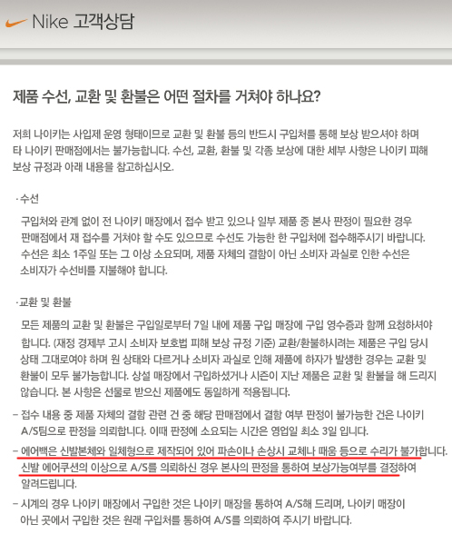 또한 나이키 관계자는 “수리 불가 제품에 대한 설명은 태그에 기재돼 있으므로 판매자가 일일이 전달하지는 않는다”며 “하지만 제품 자체의 결함으로 판정된 경우에는 당연히 보상받을 수 있다”고 밝혔다.