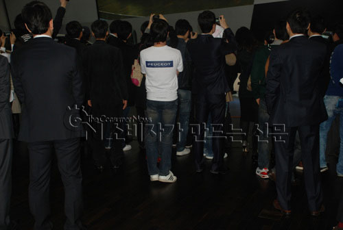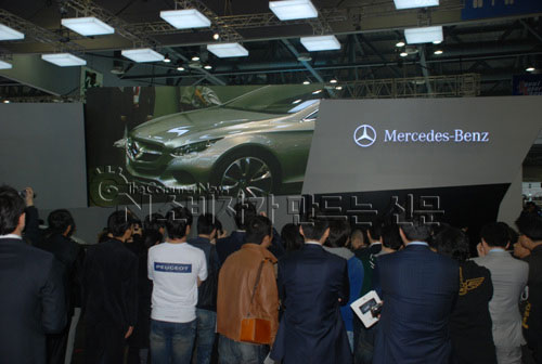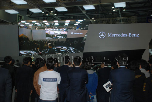 지난달 31일 경기도 고양시 일산 킨텍스에서 열린 '2011 서울모터쇼' 프레스데이 행사에서 푸조 브랜드 티셔츠를 입은 도우미가 벤츠 차량 구경을 위해 관람객 사이를 파고드는 진풍경을 연출했다.
