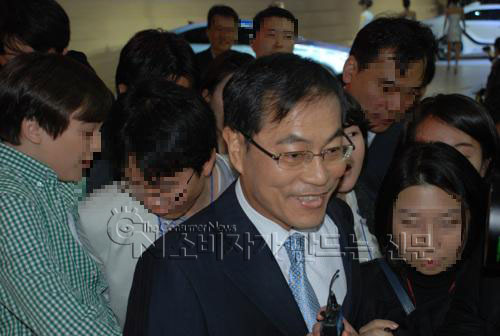 지난달 31일 경기도 고양시 일산 킨텍스에서 열린 '2011 서울모터쇼' 프레스데이 행사에서 현대차 컨퍼런스가 끝난 뒤 양승석 사장이 기자들에 둘러싸여 질문 세례를 받고 있다.