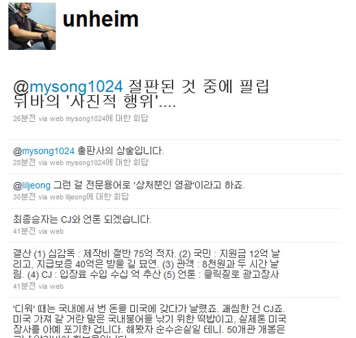 끝으로 “결산 (1)심감독: 제작비 절반 75억 적자. (2)국민: 지원금 12억 날리고 지급보증 40억은 받을 길 묘연. (3)관객: 8천원과 두 시간 날림. (4)CJ: 입장료 수입 수십 억 추산 (5)언론: 클릭질로 광고 장사. 최종 승자는 CJ와 언론 되겠습니다”고 비꼬았다.