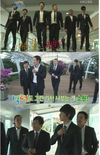 '1박2일'의 나영석 PD는 "연예인 공항패션이라고 해서 기사가 많이 난다"며 "우리도 그런 기사 한 번 나보고 싶었다"고 수트를 입게 된 배경을 설명했다. 하지만 이수근은 "공항에 웬 정장? 으로 기사 나겠다"고 받아쳐 웃음을 줬다. 멤버들 중 엄태웅과 이승기는 완벽하게 옷을 소화했지만, 강호동과 이수근은 수트가 익숙하지 않은지 연신 어색한 표정를 지었다.